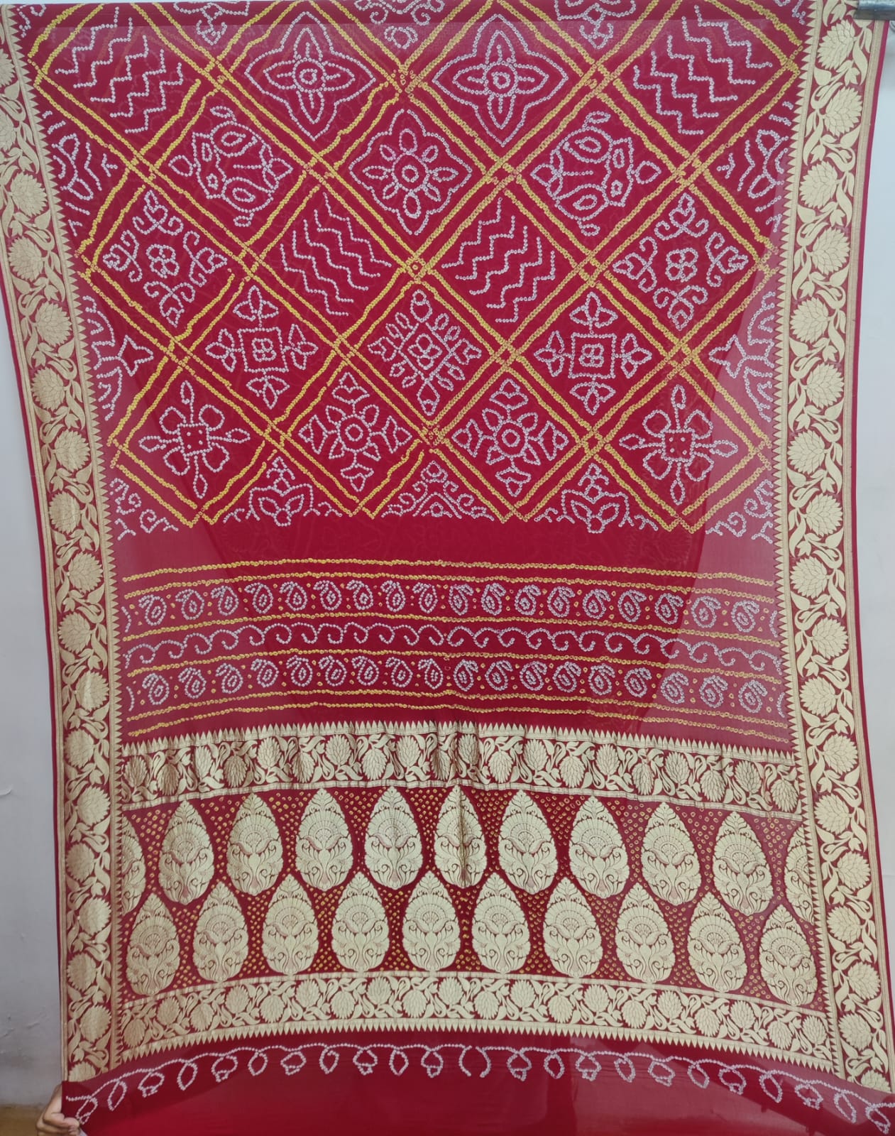 Our GEORGETTE BANDHANI collections raw fabric comes from ALL OVER INDIA, a weaving hub of DIFFERENT fabric. Sarees weaved through HANDLOOMS and BANDHANI TYE and DYE from JAMNAGAR itself cannot be replicated on machine or looms and that what makes it an exclusive outcome of our persevering artisans. This splendiferous GEORGETTE BANDHANI SAREE is both elegant and stylish.