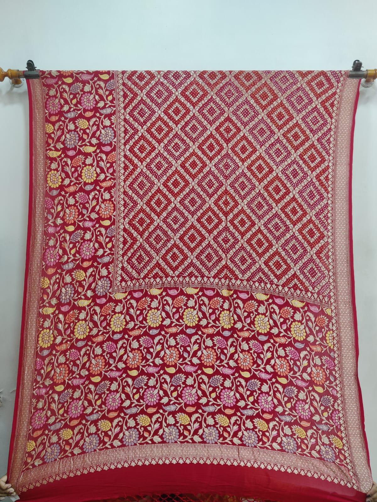 RED KHADDI GEORGETTE RAI BANDHANI SAREE