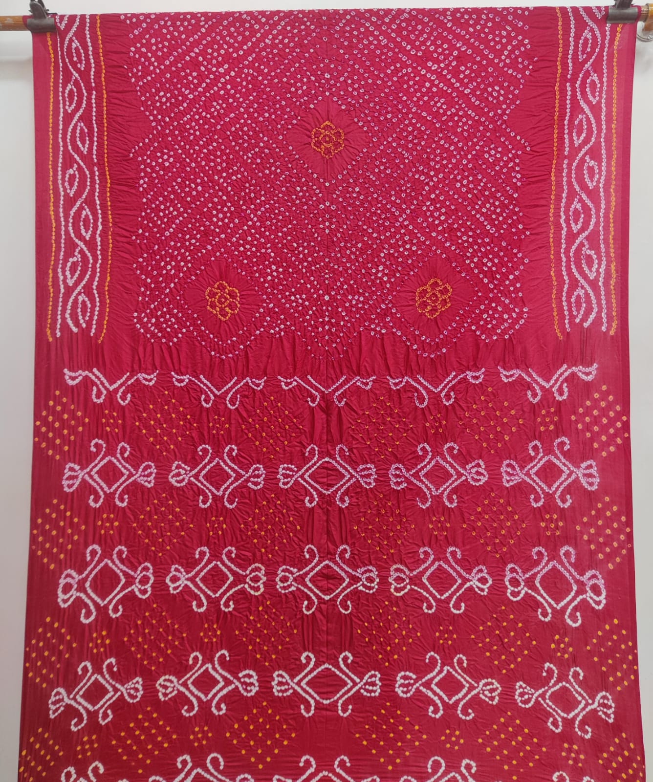 This is a hand-loom product so there might be some irregularities, but that is what makes a bandhnai saree unique. For any assistance on this product, you can email us at orders@buybandhani.com.